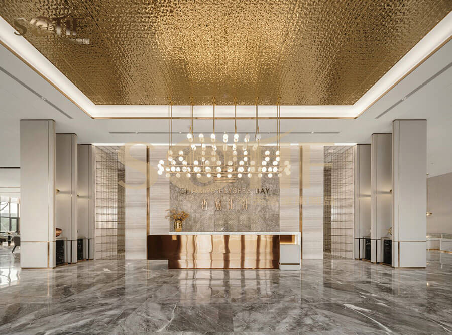 一些酒店、餐館的商業(yè)空間,頻繁的運(yùn)用到不銹鋼材質(zhì)的水波紋板,作為吊頂?shù)葏^(qū)域的點(diǎn)綴裝飾。不銹鋼的特殊材質(zhì)使得空間從視覺(jué)上層次更豐富。