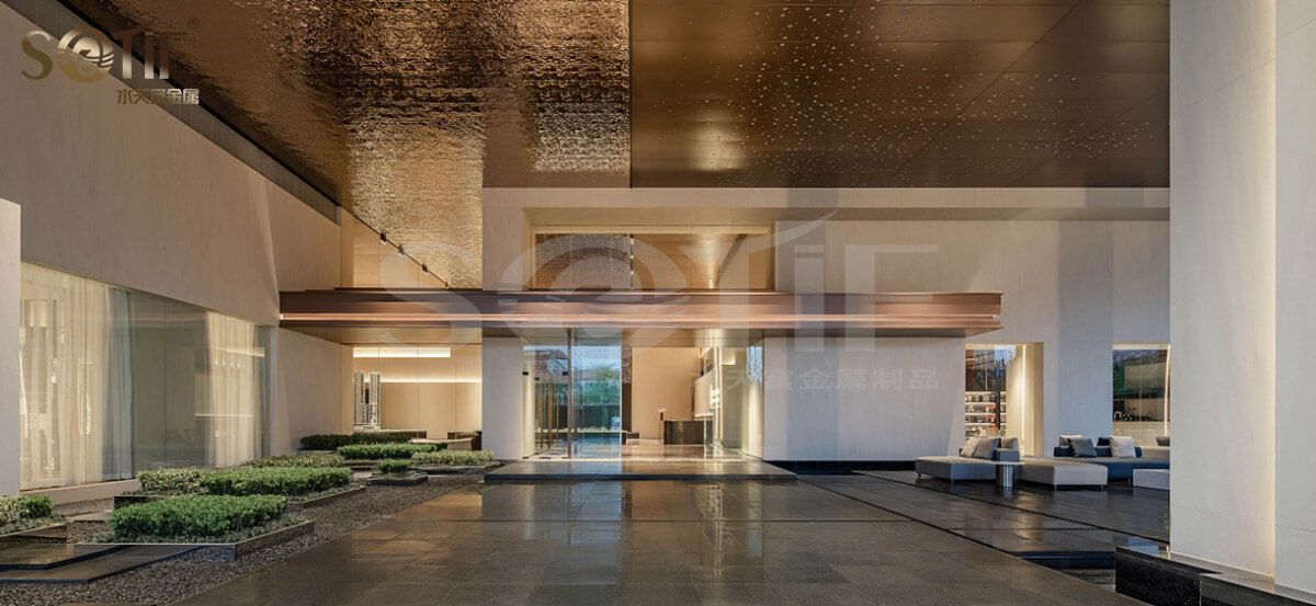 不銹鋼水波紋板被巧妙的運(yùn)用其中,毫無(wú)一絲違和感,水光粼粼的漣漪自然過(guò)渡了金色與廣告燈反射出的幽藍(lán),隔著屏幕都能令人感受到高貴優(yōu)雅的時(shí)尚氛圍。還有陳列臺(tái)、門(mén)面、裝飾墻等等的都能應(yīng)用到不銹鋼水波紋板。