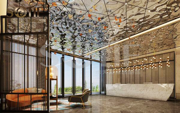 鏡面不銹鋼水波紋板運(yùn)用于頂面天花,使整個(gè)空間變得透明,不同光線或燈光下的深度變化波光粼粼,極大加深了空間美感,又有多種顏色可以選擇,顏色穩(wěn)定不褪色,外觀上表面光潔,材質(zhì)高檔,并在景觀、商場(chǎng)、酒店、會(huì)所、售樓部等場(chǎng)所被廣泛使用。